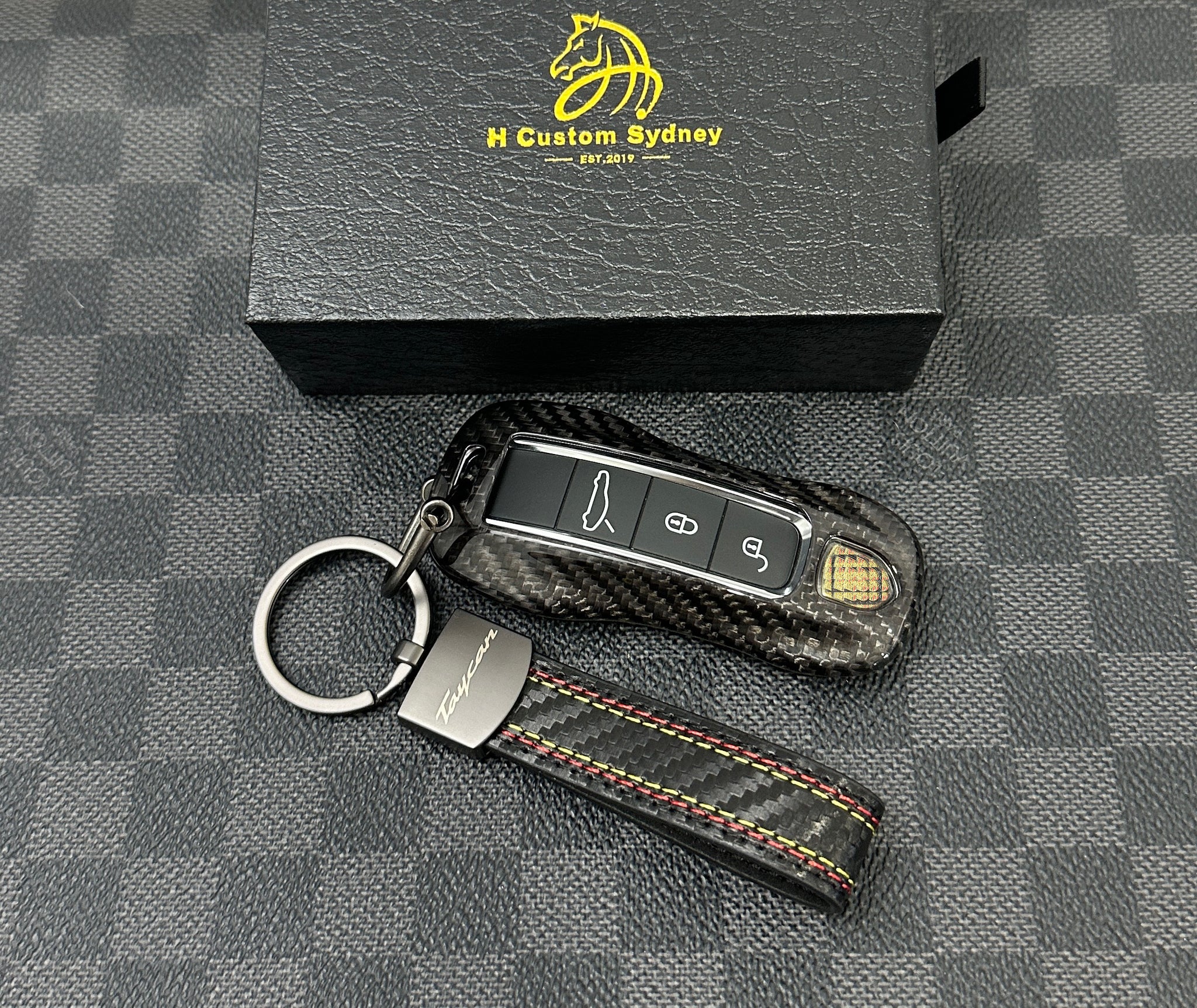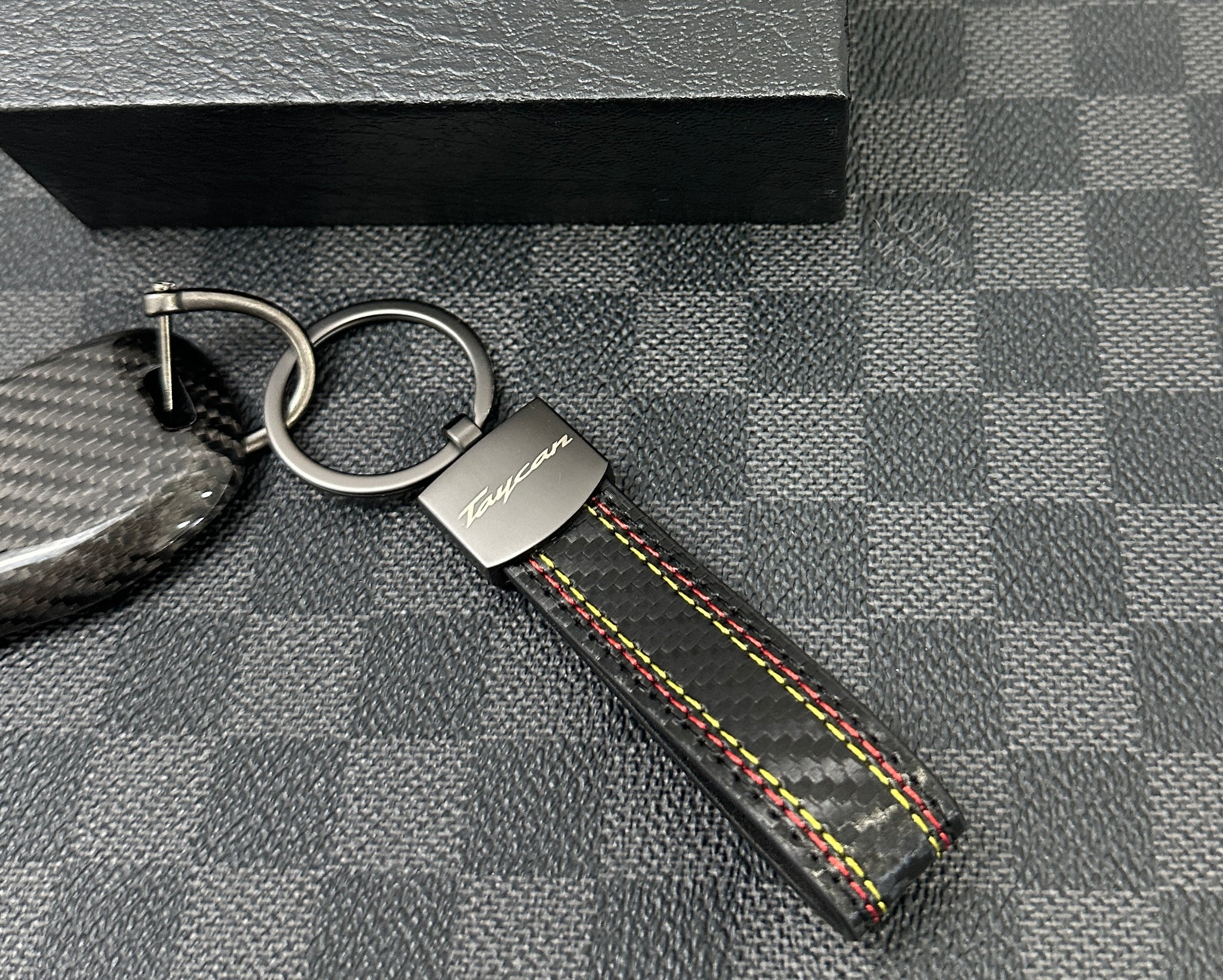 Enhance the elegance and performance feel of your Porsche Taycan with this premium carbon fiber key case and matching keychain set, designed to complement the Taycan’s cutting-edge electric sports DNA.